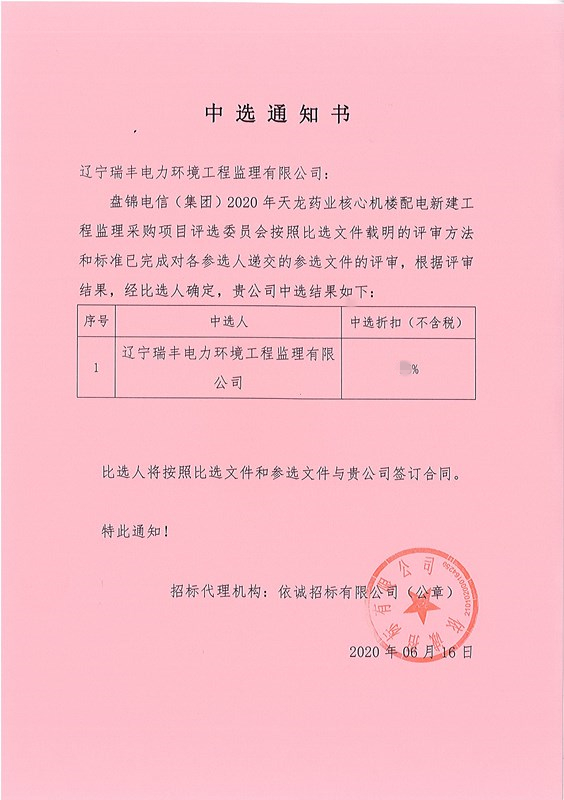 中標(biāo)喜訊-盤(pán)錦電信(集團(tuán))2020年天龍藥業(yè)核心機(jī)樓配電新建工程
