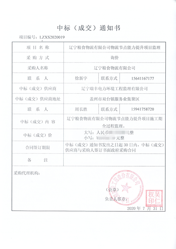 中標(biāo)喜訊-遼寧糧食物流有限公司物流節(jié)點(diǎn)能力提升項目監(jiān)理