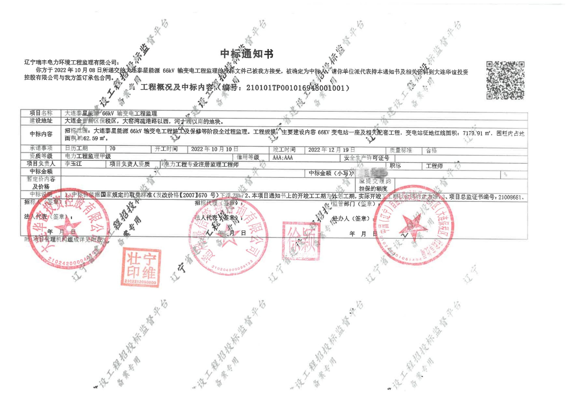 中標(biāo)喜訊-大連泰星能源66kV輸變電工程監(jiān)理