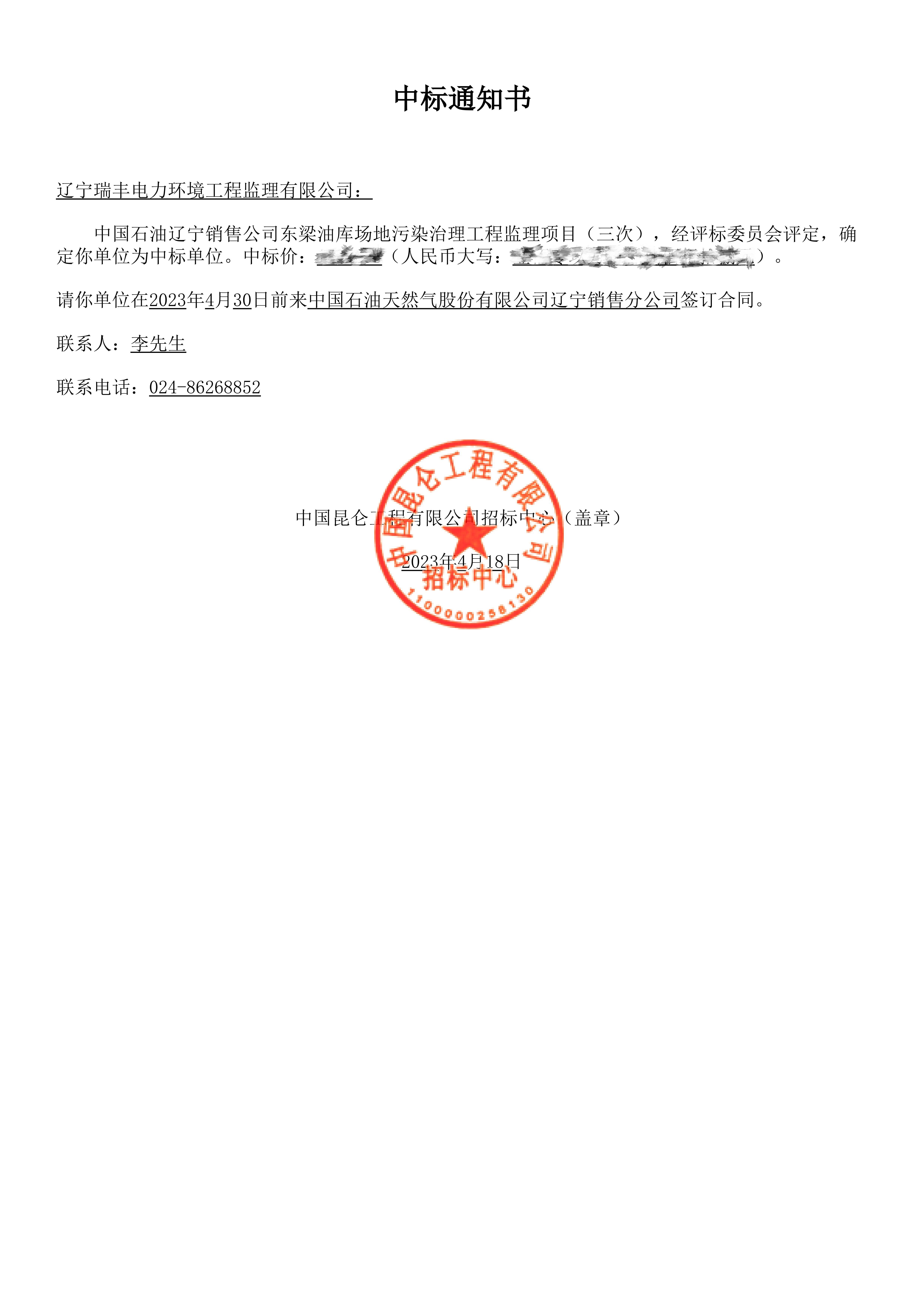 中標(biāo)喜訊-中國石油遼寧銷售公司東梁油庫場地污染治理工程監(jiān)理